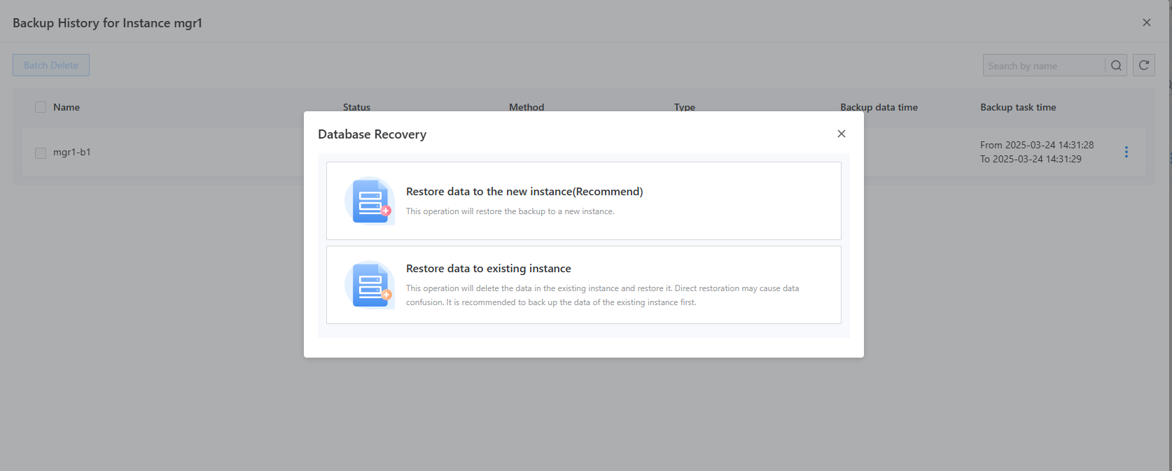 On the backup history page, after selecting a backup record, users can choose the menu on the side and click the Recovery button. The system will pop up a tab for recovery options. Different components may support different recovery methods; however, by default, all will support recovery to a new instance, while MGR additionally supports recovery to an existing instance.