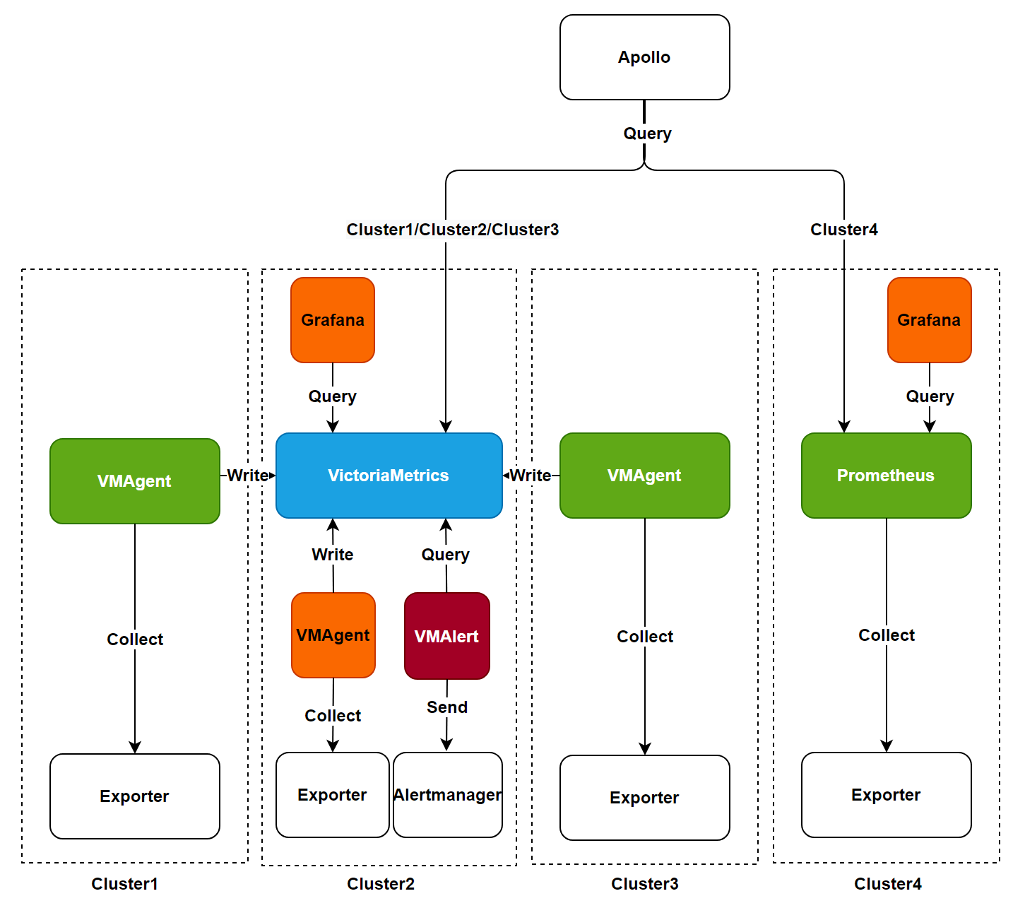 • Uses VMAgent to collect data and write to VictoriaMetrics.
